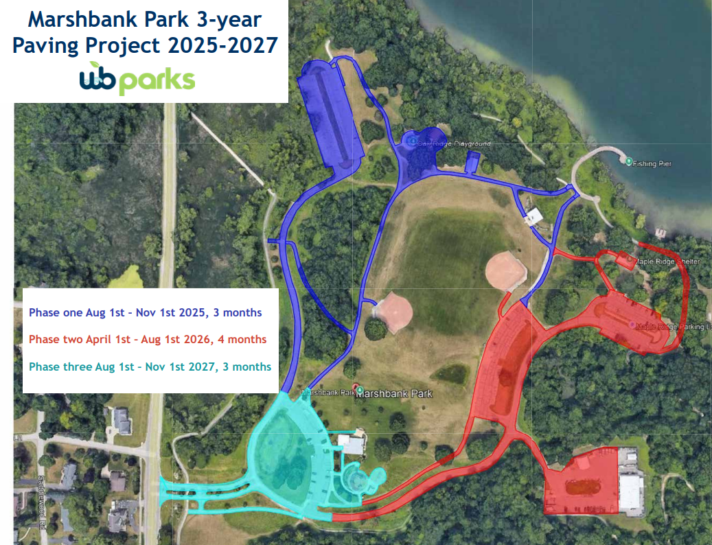 Please note: All paved surfaces at Marshbank Park will be replaced over the next three years, starting this August. The map below indicates which areas of the park will be replaced and when. Some areas of the park may be closed during the timeframes below. We appreciate your patience as we work to improve the park!